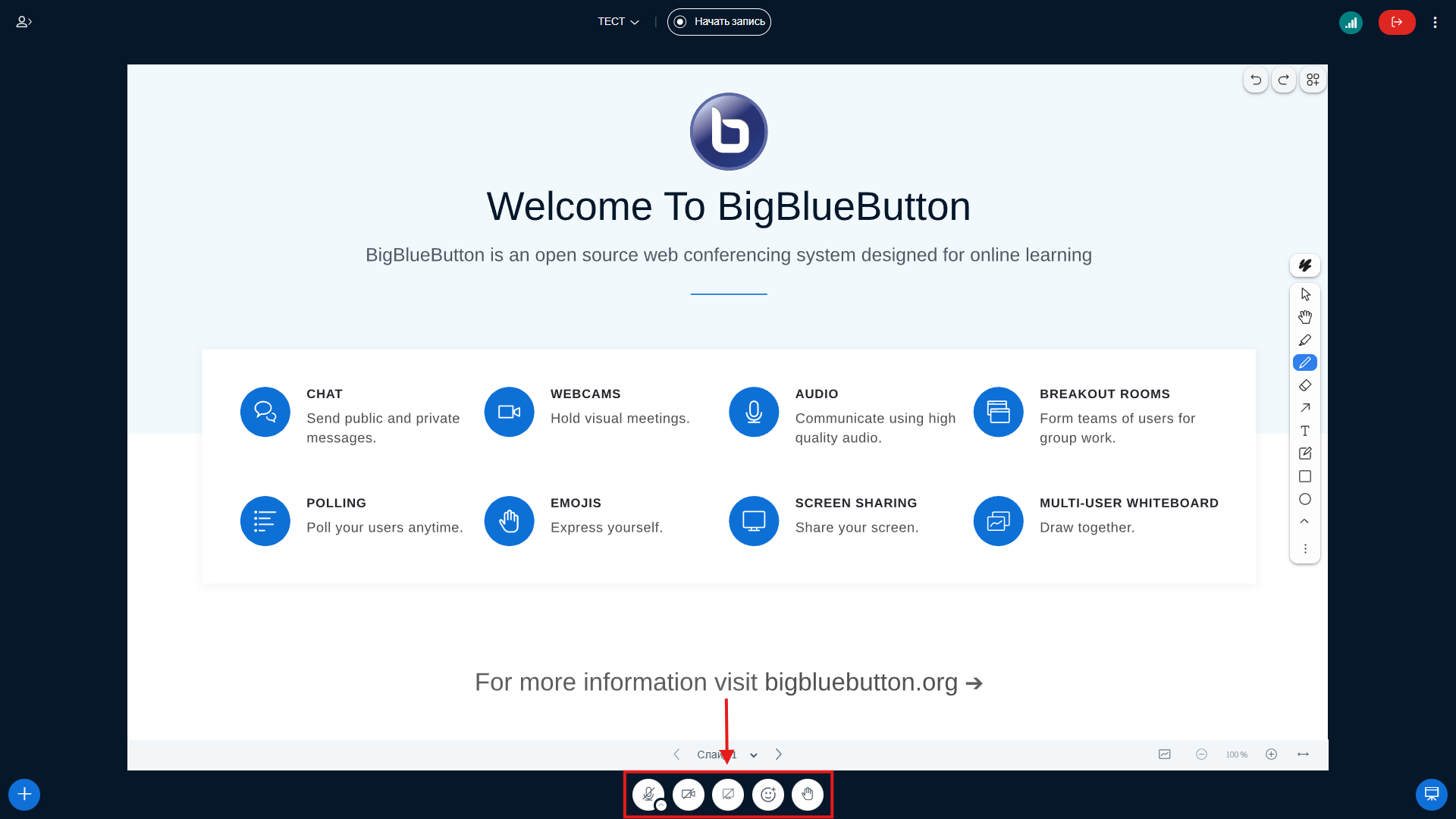 В нижней панели предоставлены инструменты как по управлению сессией, так и пользовательскими унопками.
