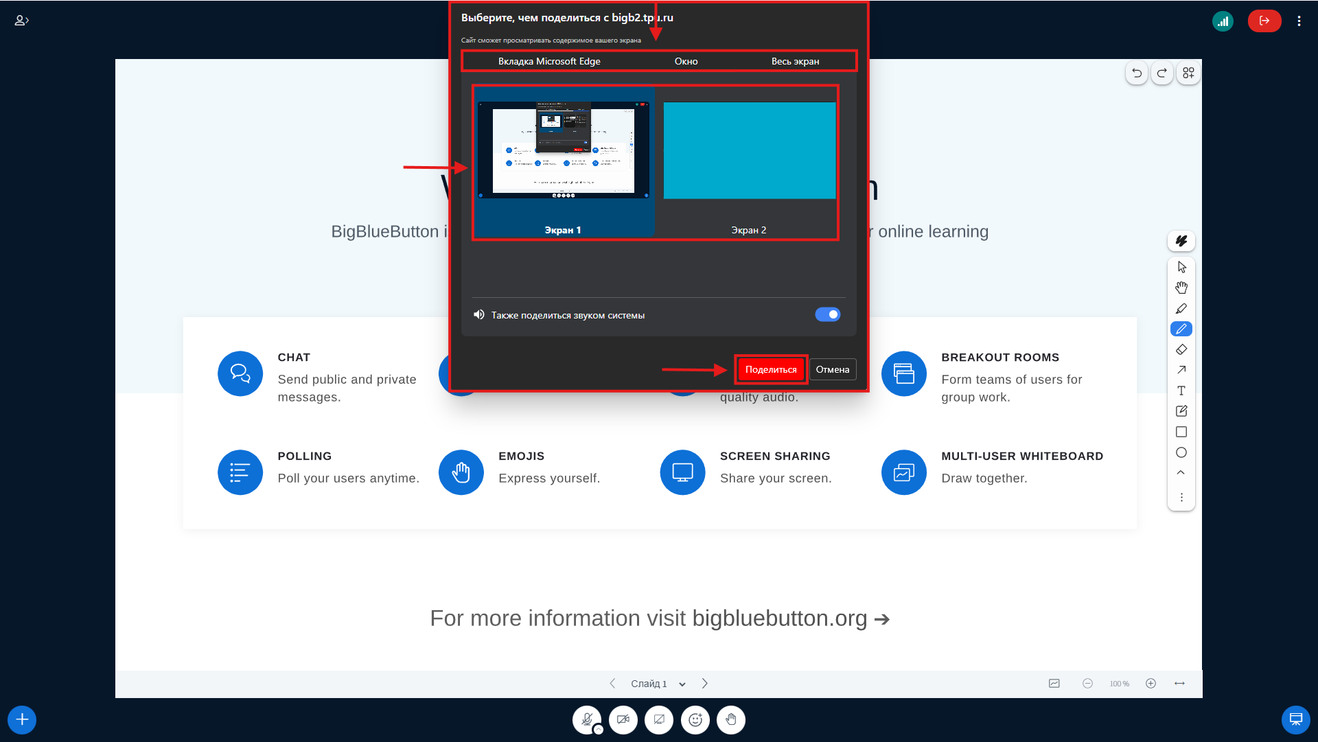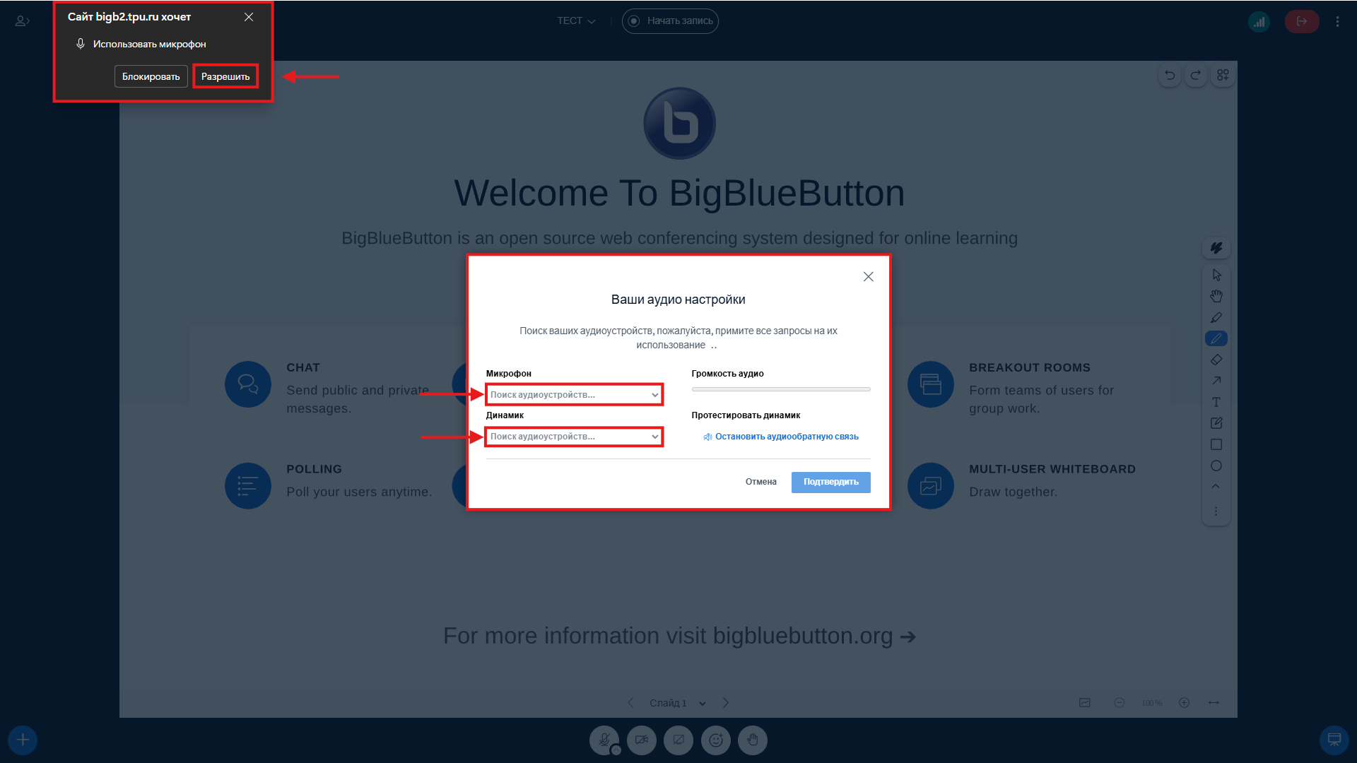 При первом включении микрофона, камеры или демонстрации экрана: